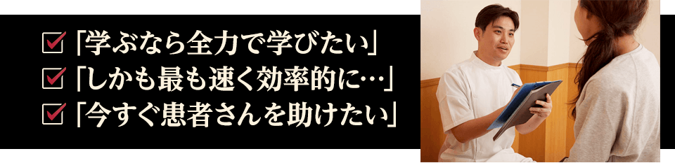 そう考えたとき、あなたにできることはただ1つ。「最善の選択肢を選ぶ」ということではないでしょうか。一番効果のある治療方法を、最も速く効率よく習得して、すぐにでも患者さんに貢献したいのであれば、あなたが最速で“本物”になれる環境に身を置くということが最も重要なのではないでしょうか。今回はそんなあなたのために最高の環境をご用意しました。