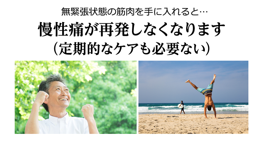 あなたが抱えている腰痛や肩こり、関節痛などは消えてなくなるでしょう。整体に通い続けたり、サプリメントを飲んだり、毎日自宅で30分ケアする必要はありません。だから、これ以上身体のケアにお金をかけなくても大丈夫です。あらゆる慢性痛が消失して、数年経っても再発しない身体が手に入ります。