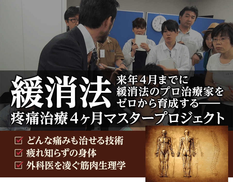 2019年5月~8月の4ヶ月間で緩消法による疼痛治療をマスターしていただけるプロジェクトです。緩消法の技術認定者の資格を獲得するためには、このプロジェクトへの参加が必須条件の1つとなります。努力次第ですが、自分自身をケアして限りなく無緊張に近い筋肉を手に入れていただくこともできるので、一生の財産になるでしょう。ぜひご参加ください。